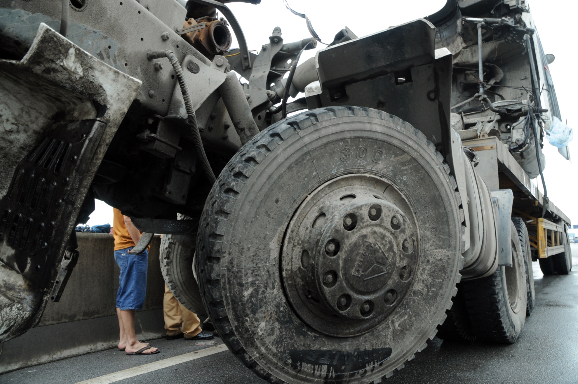 Trước đó, sau khi trèo lên dải phân cách, xe còn cày tiếp khoảng 10m làm gãy trục của đầu kéo.