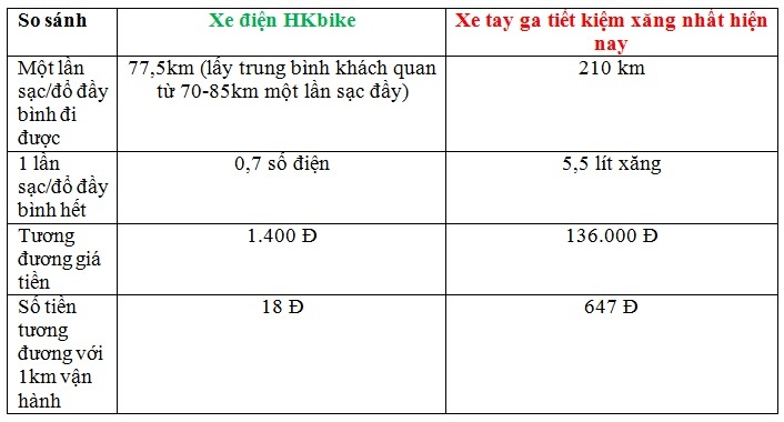 Với khả năng một lần sạc đầy đi được quãng đường 70-85 km, và cùng quãng đường di chuyển này so sánh với xe ga tiết kiệm xăng nhất hiện nay trên thị trường, thì xe này hết khoảng hơn 50.000 đồng tiền xăng, số tiền đắt gấp 36 lần so với số tiền điện phải trả khi sạc cho công nghệ pin mới của xe điện.