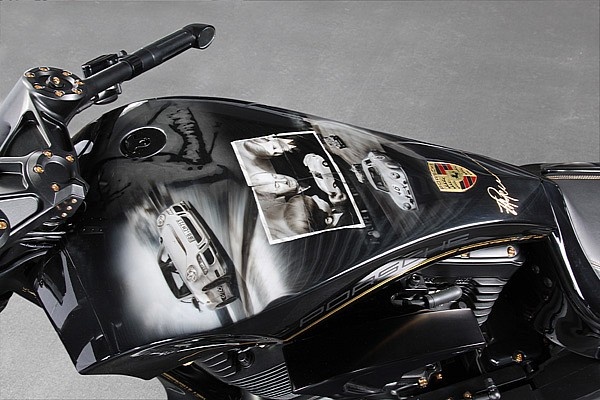 | Thân xe khá nổi bật với logo và nhiều mẫu xe thể thao của hãng Porsche. |
