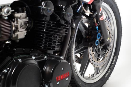 | Maarten đã chỉnh sửa khung của chiếc XS850 theo đúng kết cấu chuẩn và để lắp vừa bình xăng mới, được chỉnh sửa từ một chiếc Honda Bol d’Or – phần đuôi “uể oải” của chiếc bình cũ đã bị lươc bỏ. Bình xăng sau khi chỉnh sửa trở nên vừa vặn đep mắt với chiếc nắp Monza cổ điển. Hệ thống giảm xóc cũng được thay đổi đáng kể. Giảm xóc trước là từ chiếc Yamaha YZF-R6, với bộ HyperPro nâng cấp thêm. Phanh và tay lái Clip-on cũng từ chiếc R6, cùng với chạc ba trên của xe đã nâng cấp. |