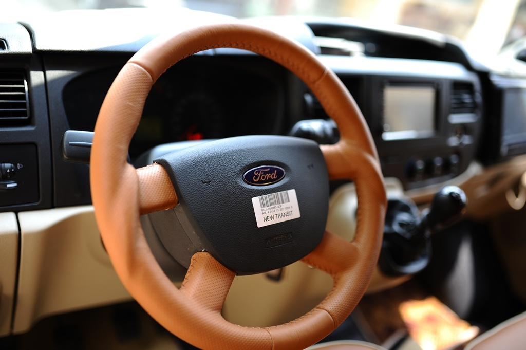 | Tay lái bọc da và màn hình DVD 2 DIN với camera quan sát hành khách. |