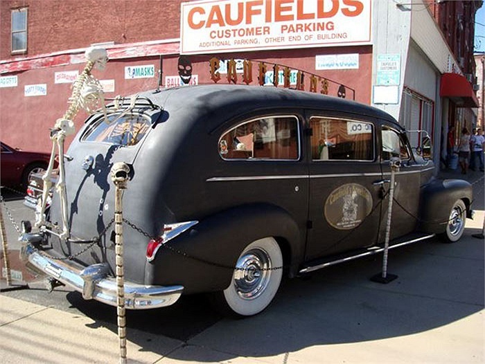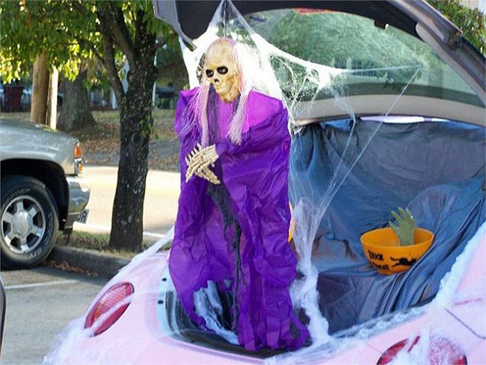 Chiếc xe màu hồng nữ tính đối lập với hình ảnh kinh dị của bộ xương khô. |