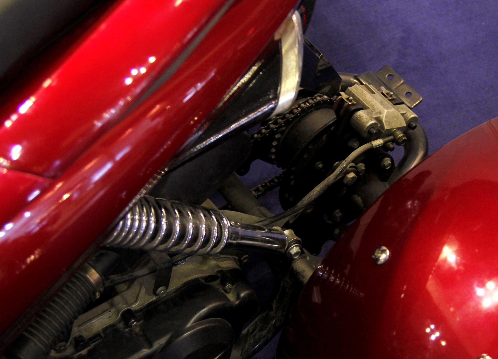 | Năng lượng được truyền tới bánh sau bằng dây xích chứ không phải dây cu-roa như trên những chiếc xe tay ga thông thường. Phía sau, xe cũng được trang bị thắng đĩa. |