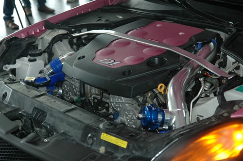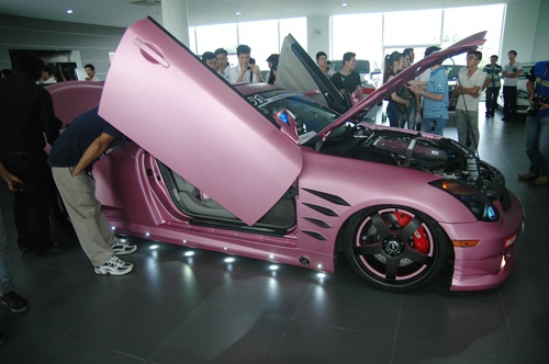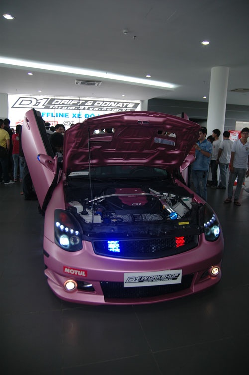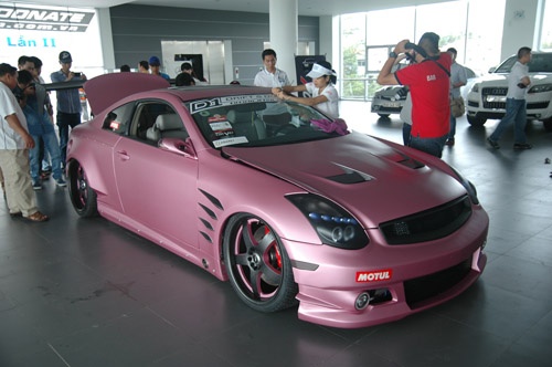 Infiniti G35 phiên bản độ Hello Kitty nổi bật tại triển lãm với bộ cánh có màu sơn nhám hồng rất độc đáo. Đây là mẫu xe duy nhất tại Việt Nam có nước sơn như vậy. Đồng thời, thân xe cũng được gắn thêm nhiều món đồ chơi, làm thay đổi đáng kể diện mạo nguyên gốc của xe.