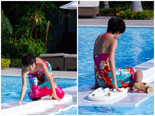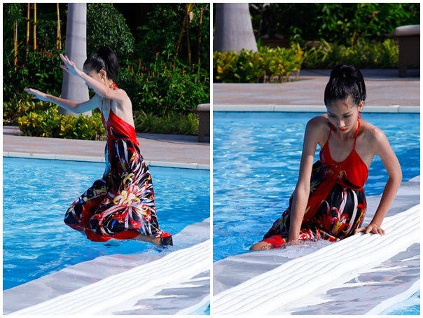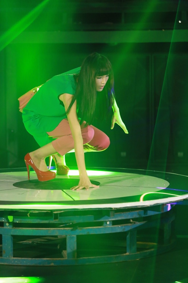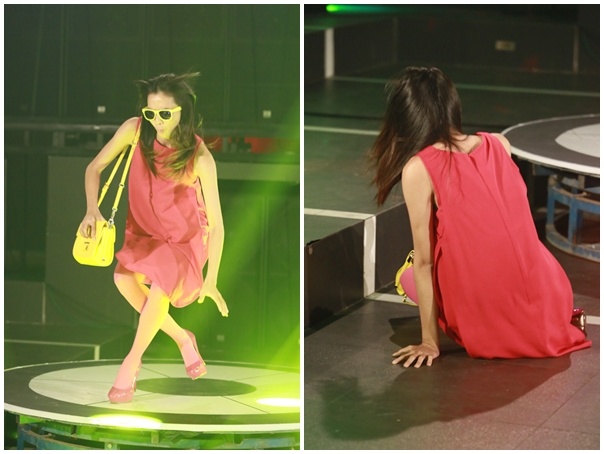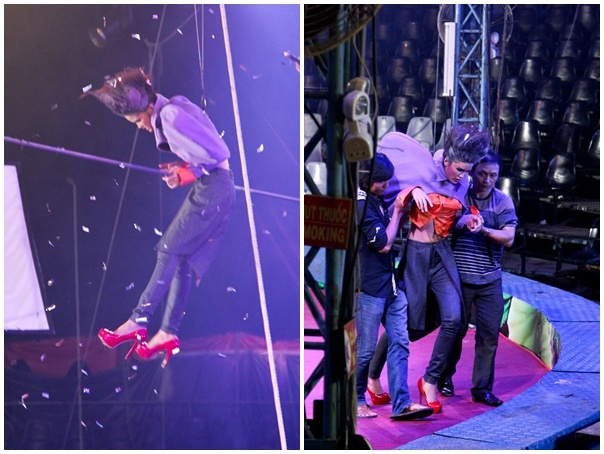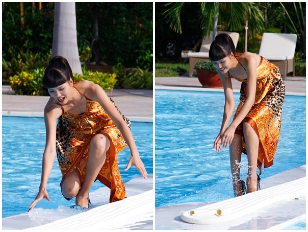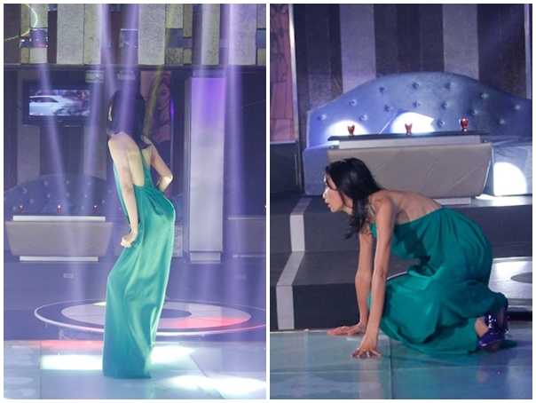 | Mâu Thanh Thủy trượt chân và té ngã trong phần thể hiện của mình, dù vậy cô vẫn có được tấm ảnh đẹp lọt nhóm thí sinh an toàn. |