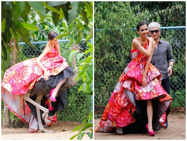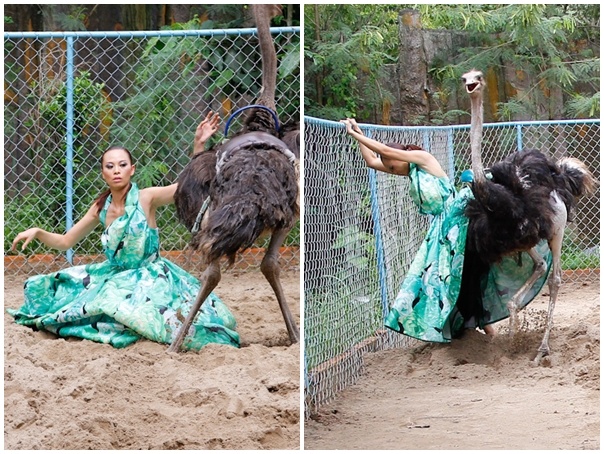 Phần thi chụp ảnh với động vật là một trong những thử thách truyền thống của Vietnmam's Next Top Model, Mâu Thanh Thủy đã bị té ngã khi không kết hợp được với ''bạn diễn''. Không nản chí, người đẹp tiếp tục ''thuyết phục'' đà điểu. Tấm ảnh tạm ổn giúp Thanh Thủy lọt nhóm an toàn.