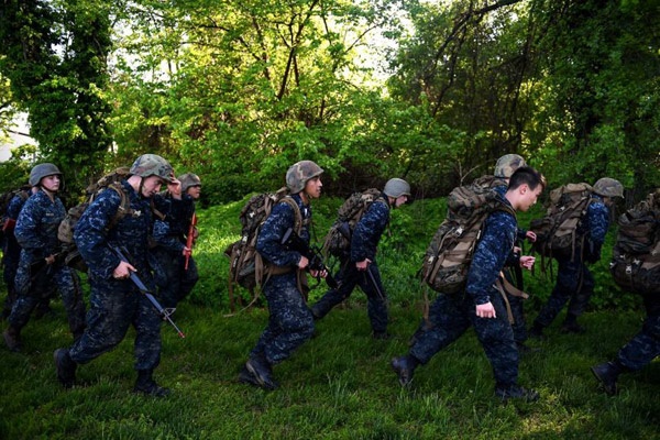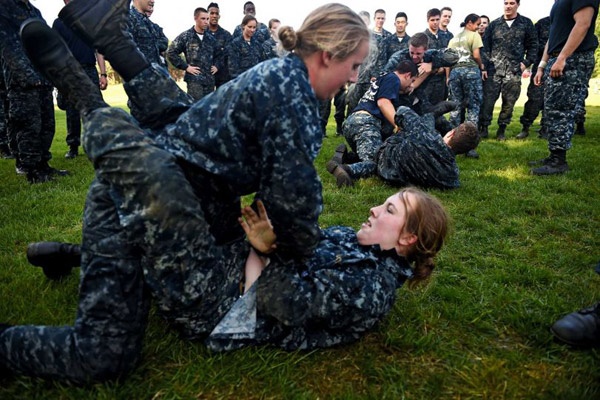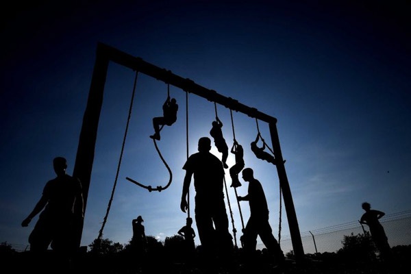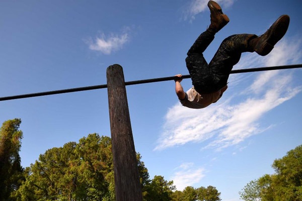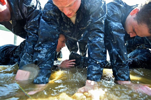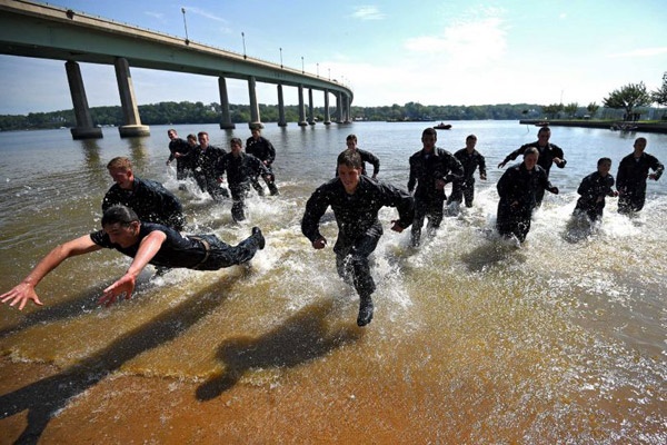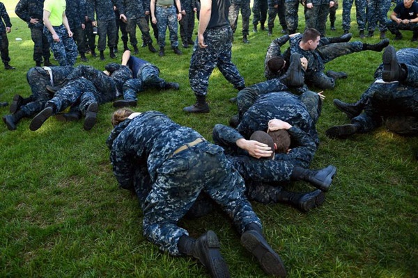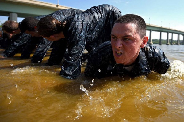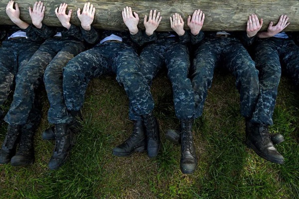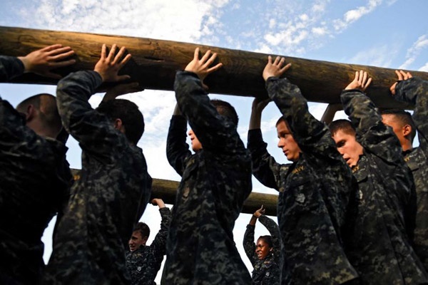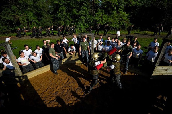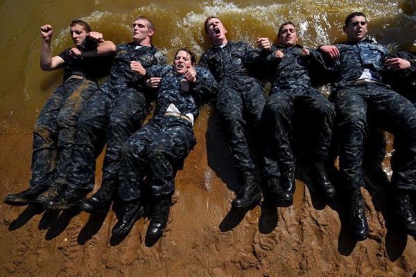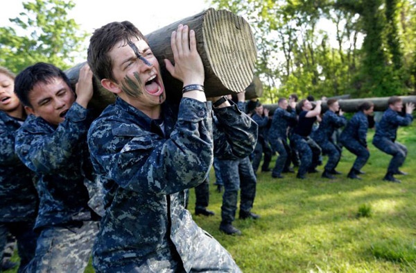 | Phillip Metcalfe hét lên khi cùng đồng đội nhấc cây gỗ trong suốt thử thách có tên gọi Sea Trials - thử thách kết thúc năm học đầu tiên ở học viện Hải quân Mỹ. |