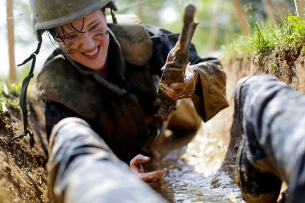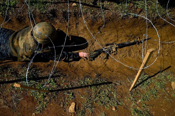 | Một chuẩn úy năm thứ nhất đang bò trườn trên bùn. |