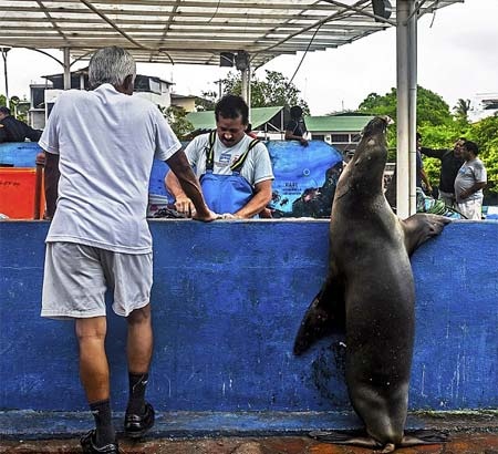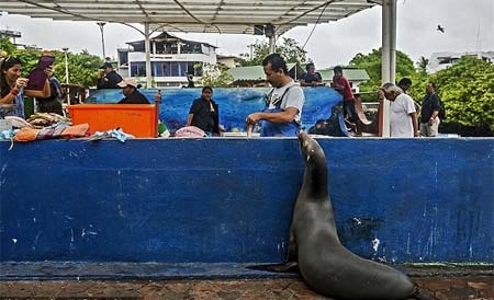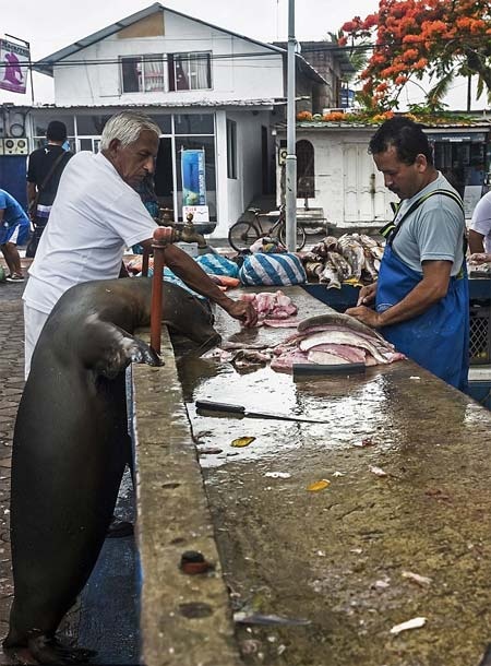 Cảnh tượng "xưa nay hiếm" đã lọt vào ống kính của nhiếp ảnh gia Kristhian Castro trong chuyến thăm đảo Santa Cruz. Ông cảm thấy vô cùng kỳ lạ khi chứng kiến một con sư tử biển "đổ bộ" lên bờ, tới một quầy bán cá chờ "kiếm chác" và quay trở lại biển sau đó. Tuy nhiên, đối với dân địa phương thì chuyện này là hết sức bình thường.