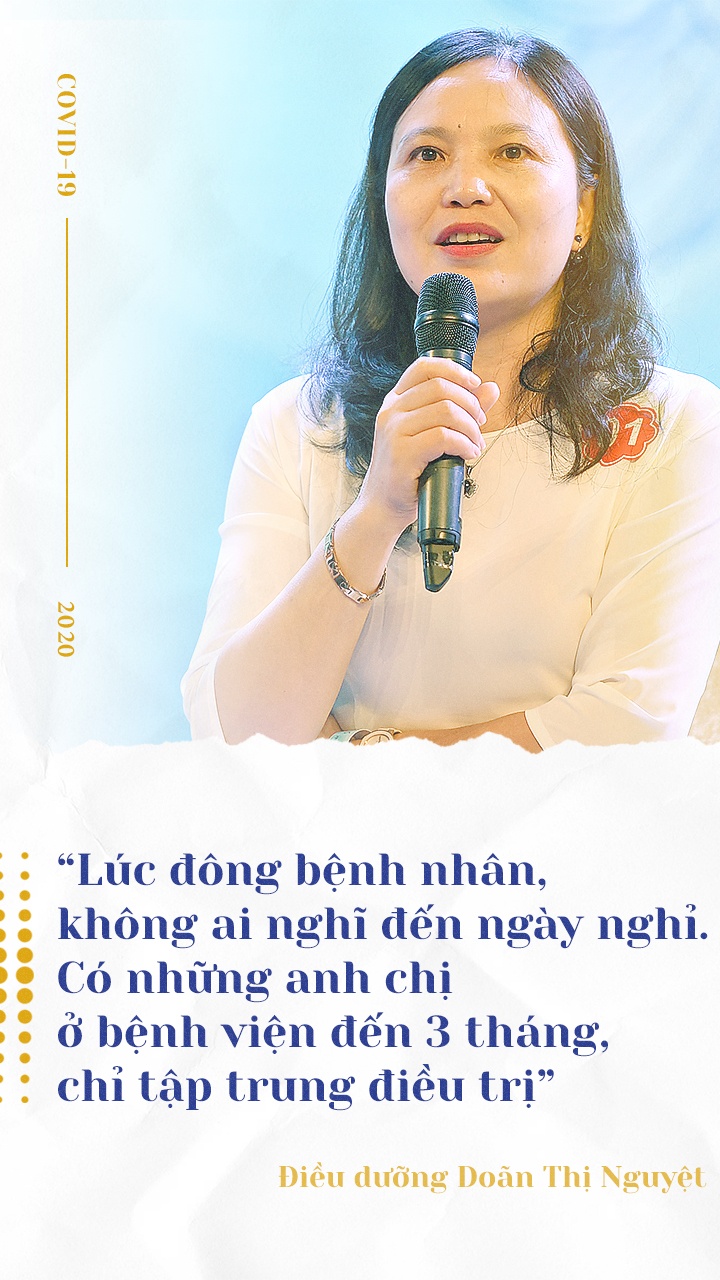 Trong những ngày chống dịch, các điều dưỡng và bác sĩ điều trị trực tiếp cho bệnh nhân Covid-19 thường phải ở lại cơ sở điều trị dài ngày, chỉ được thấy gia đình qua vài phút gọi video ngắn ngủi. Nữ điều dưỡng chia sẻ: “Lúc đông bệnh nhân, không ai nghĩ đến ngày nghỉ. Có những anh chị ở bệnh viện đến 3 tháng, chỉ tập trung vào điều trị. Khi số lượng bệnh nhân giảm đi, chúng tôi thực hiện chiến lược tham gia trực tiếp 14 ngày, tiếp đó là cách ly 14 ngày, rồi về với gia đình 5-7 ngày”.