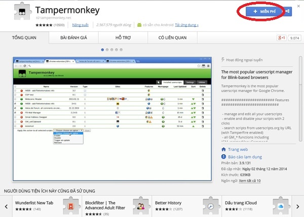 Bước 1: Vào trang phần mở rộng nền Tampermonkey dành cho Chrome và bấm MIỄN PHÍ để cài đặt.