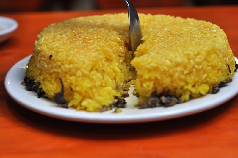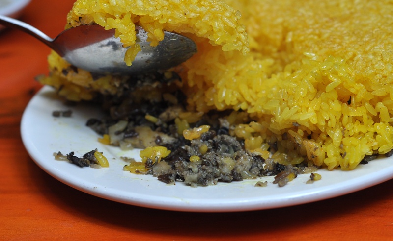 Trông ngon, lạ mắt nên chúng tôi nhanh chóng mổ xẻ "chiếc bánh" hấp dẫn này. Dùng thìa, cắt một đường cơ bản, tôi hơi thất vọng khi thấy ruột “bánh” chỉ một màu vàng ươm… của xôi nếp, chứ không điểm lẫn cẫn ốc như ban đầu hình dung. Vậy là ốc chỉ có ở phần đế dưới cùng. Phần đế này có lẽ cần dày lên hơn nữa thì mới thỏa mãn kẻ thích “dỗ mồi” như tôi.
