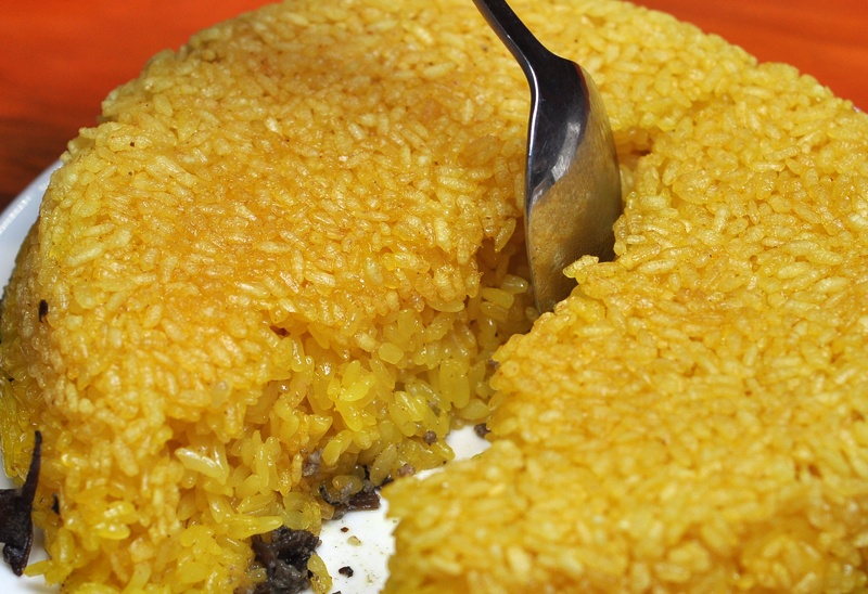 Xôi ốc chắc hẳn làm mất thời gian nên phải 15 phút sau khi gọi, nhân viên mới bưng tới. Món thoạt nhìn giống như chiếc bánh xôi lớn, bắt mắt, có phần vỏ ngoài vàng rộm, dưới cùng lót một lớp đế mỏng chính là ốc.
