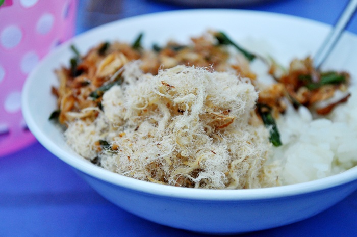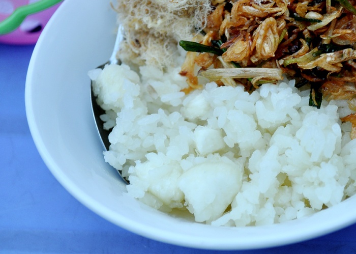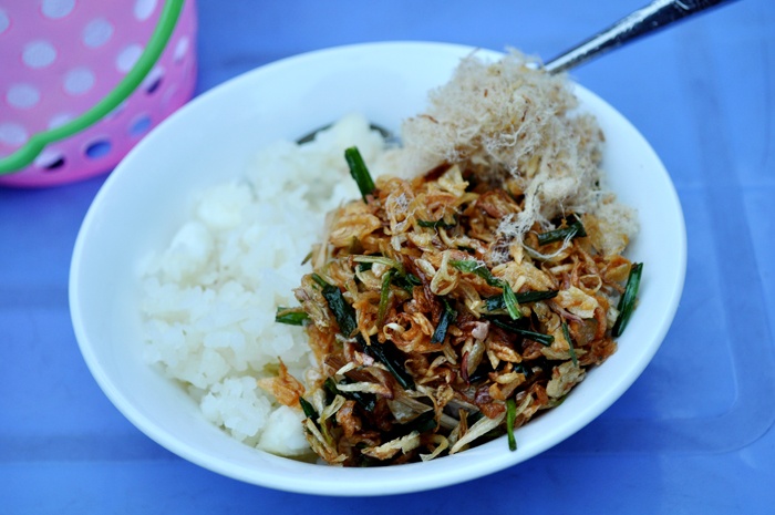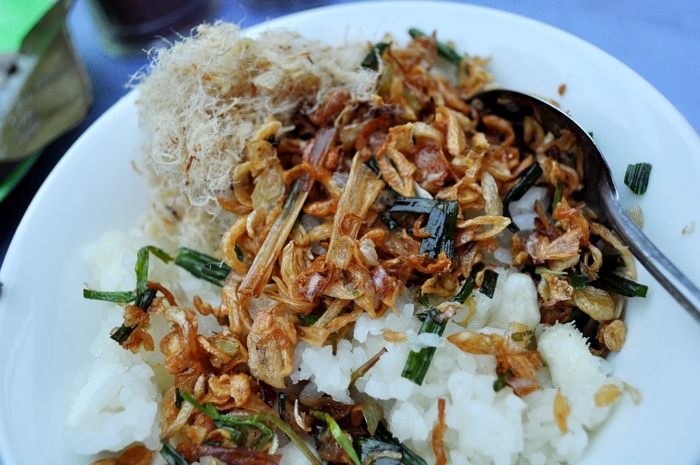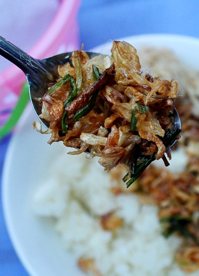 Bát bưng ra nom cũng có "đạm" là ruốc đi kèm. Nhưng theo chị chủ quán, đắt nhất chính là phần hành phi phủ đầy ắp bát. Chị bảo, hành phi do nhà tự làm, không phải loại bán cân ngoài chợ, chi phí đắt ngang với thịt, nhưng nhờ thế mới giòn tan, thơm phức hơn hẳn mọi nơi, đưa đẩy được xôi sắn trở thành món không tầm thường.