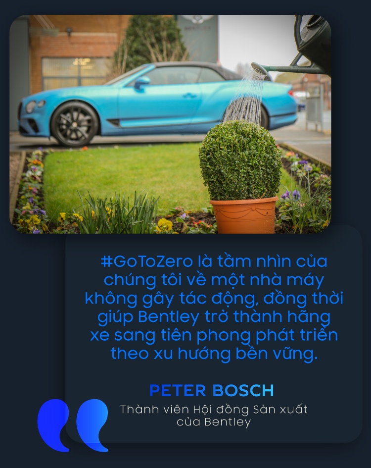 Peter Bosch, thành viên Hội đồng Sản xuất của Bentley, nhận xét: “#GoToZero là tầm nhìn của chúng tôi về một nhà máy không gây tác động. Chiến dịch tạo động lực để chúng tôi khử carbon từ hoạt động sản xuất của mình, giảm lượng chất thải, tái chế và nâng cao hiệu quả sử dụng tài nguyên. Ngoài ra, chiến dịch tập trung sự chú ý của mọi người vào tầm nhìn để Bentley trở thành hãng xe sang tiên phong phát triển bền vững và đạt mục tiêu trung hòa carbon vào năm 2030”.