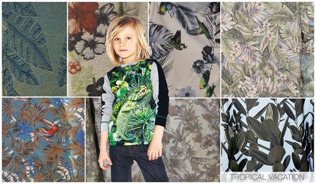 | Thiết kế họa tiết nhiệt đới là lựa chọn phù hợp cho những bé trai đã chán diện đồ ‘bụi’. Các hoa văn hiện đại mà không hề nữ tính là hoa thược dược, lá cọ, các loài chim nhiệt đới, thằn lằn v.v… |