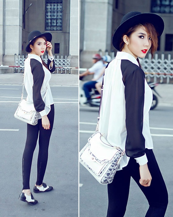 | Ngọc Quyên cực chất với style đường phố hai gam màu huyền bí trắng đen. |