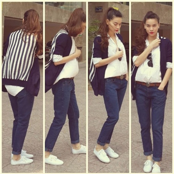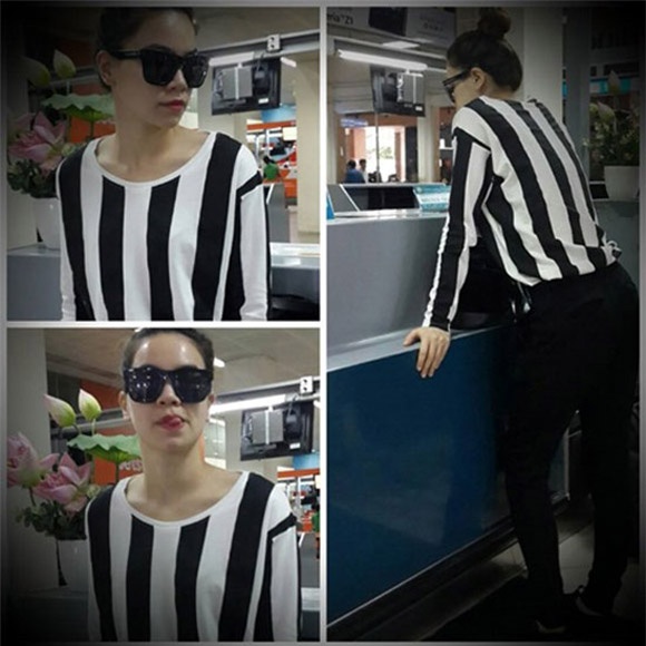 | Hồ Ngọc Hà thường sử dụng áo kẻ sọc cho những chuyến đi từ thiện hay đi chơi tạo nét năng động và hiện đại. |
