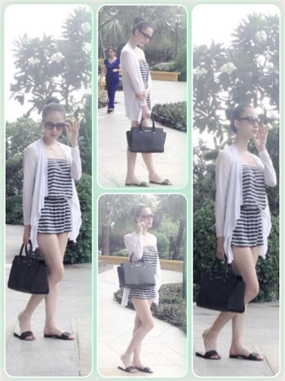 | Thái Hà trẻ trung quyến rũ với váy kẻ sọc ngang cùng áo khoác trắng nhẹ bay ngoài. |
