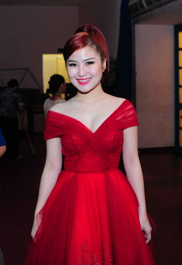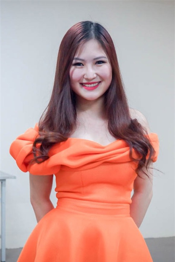 | Linh Nga nổi bật và đáng yêu trong bộ đầm trễ vai màu hồng cam. |