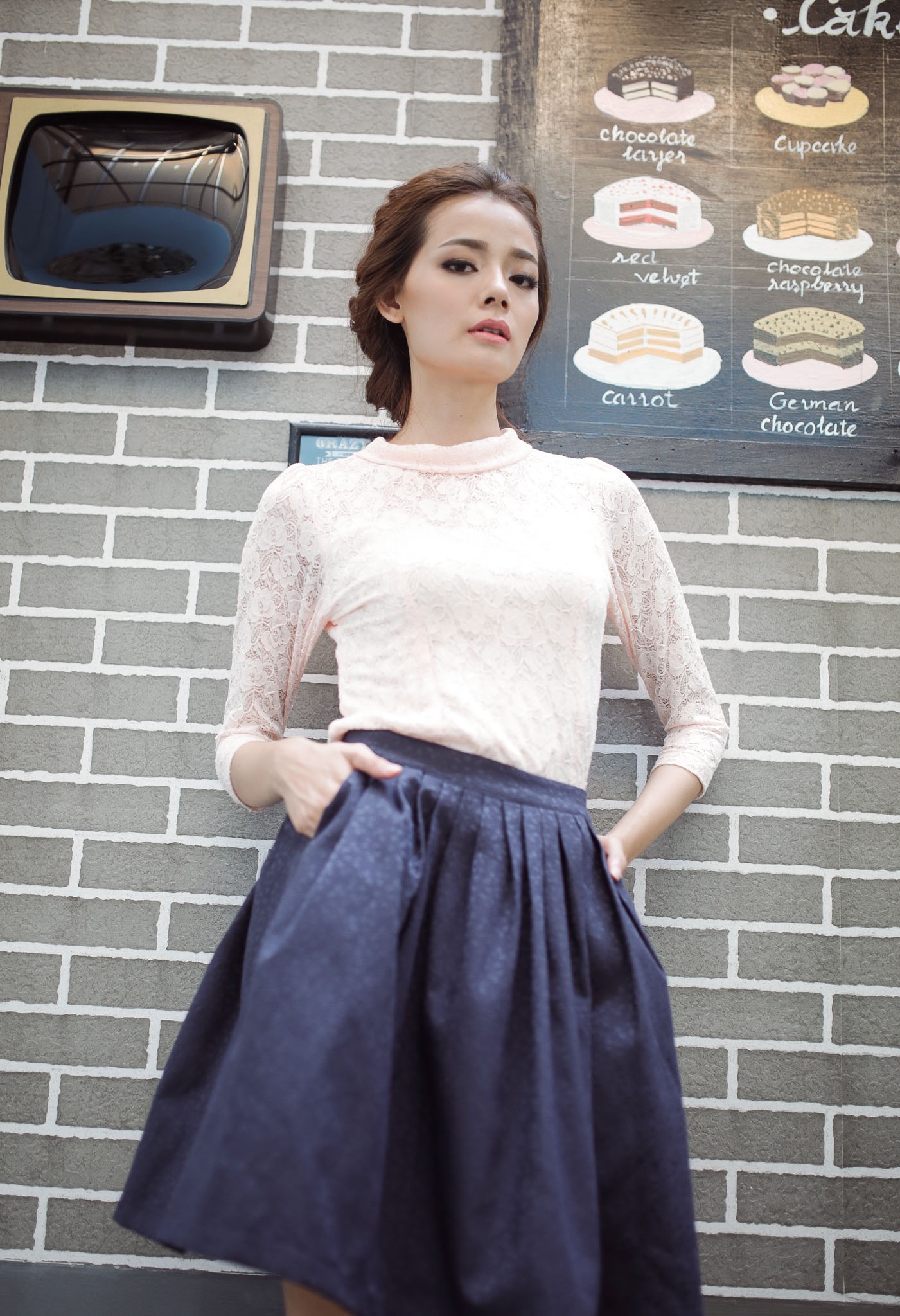 | Không chỉ chất liệu trơn, trên nền hoa văn màu pastel trở nên đặc biệt hơn, chiếc áo ren màu hồng dâu dáng ôm vừa phải giúp các nàng khoe hình thể. |