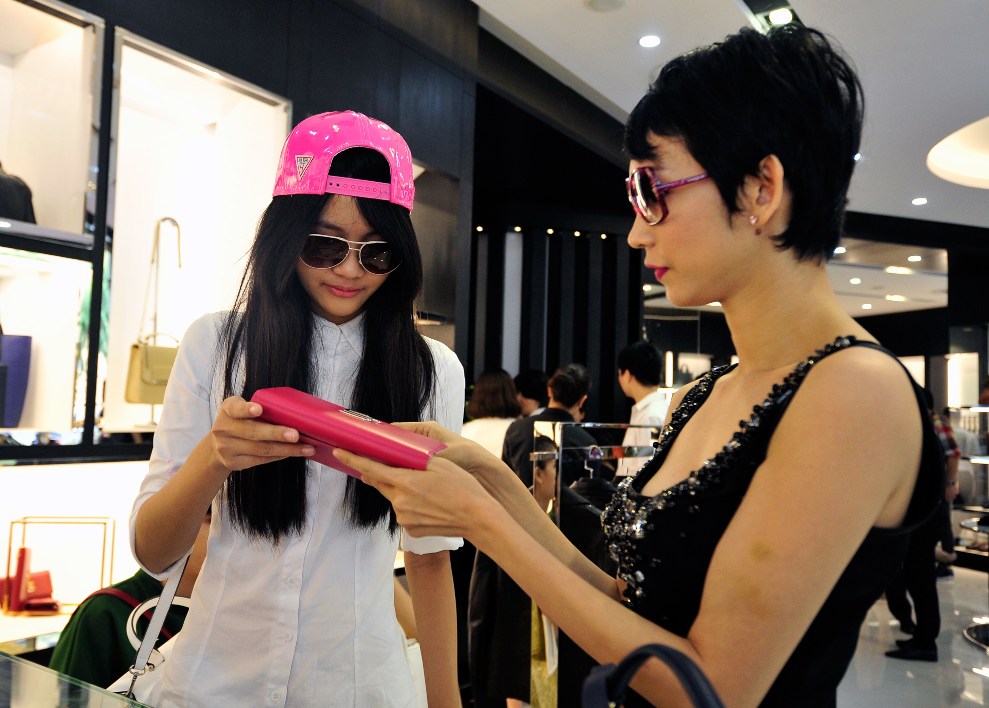 | Cô học trò Mẫn Nhy 13 tuổi - học viên trường đào tạo người mẫu CA3 được Xuân Lan đích thân lựa chọn ví da cho hợp với tông màu chiếc mũ của cô bé. |