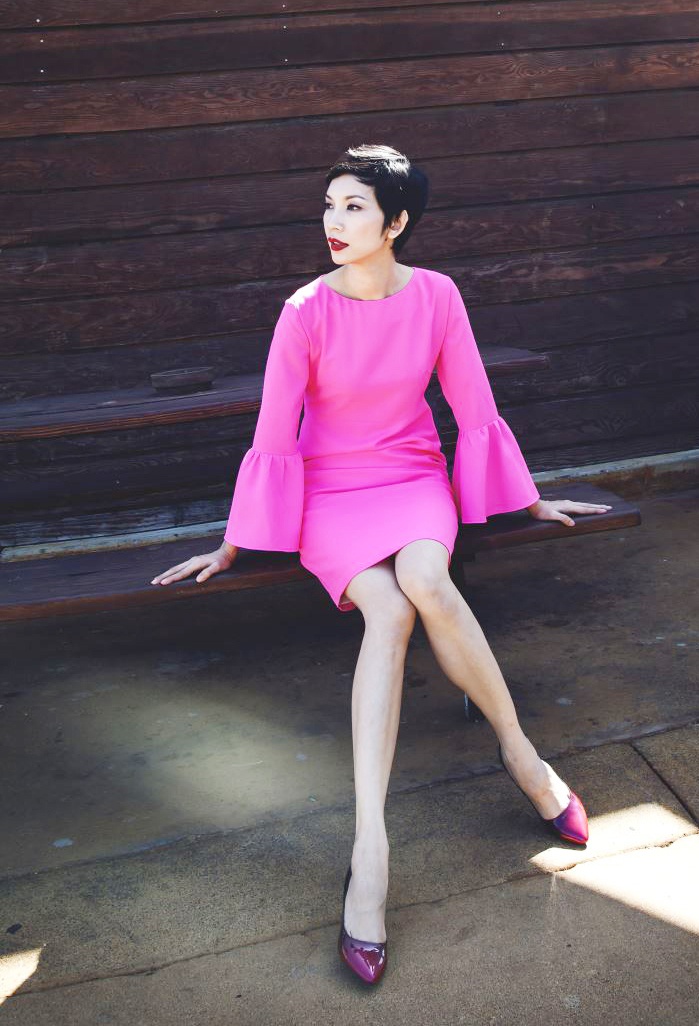 | Dáng đầm kín đáo, cổ điển là chọn lựa không tồi cho nữ giám khảo có ngoại hình cá tính. |