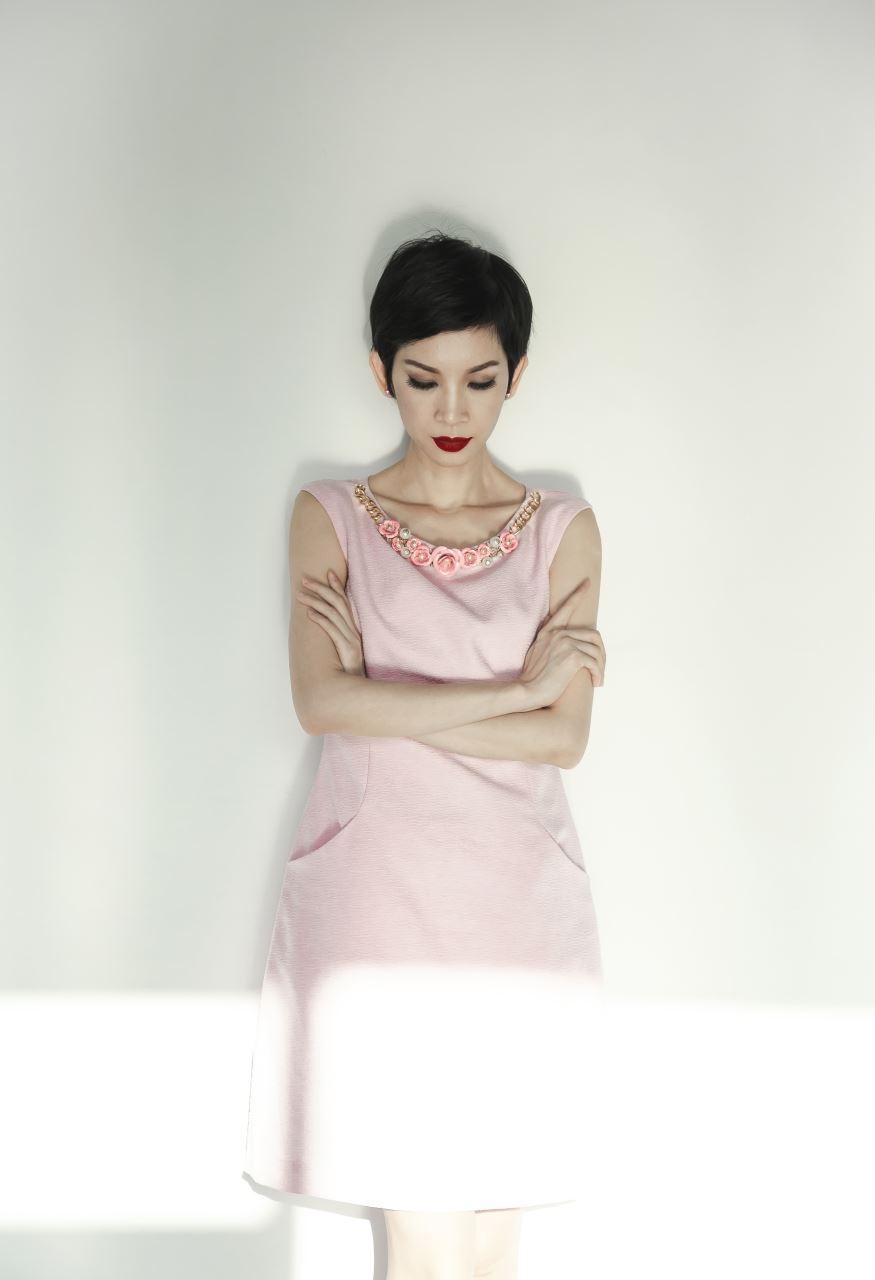 Tông màu hồng, trắng tạo nên sức hút tươi trẻ cho người mặc. Bộ ảnh được hỗ trợ bởi stylist Hiếu Anh, trang điểm Travis Vũ, trang phục Premium by Elise.