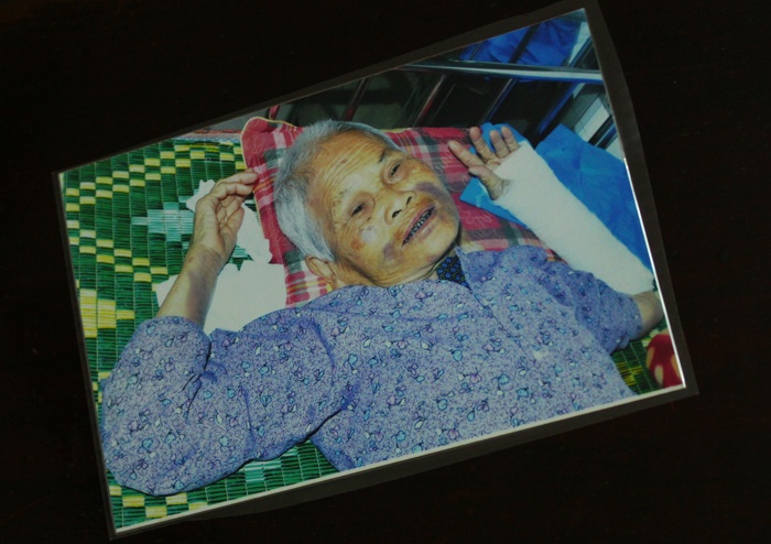 Thấy bà lão 92 tuổi đang ngồi ở thành giường, hai chân thõng xuống dưới đất, Thảo quát mắng xối xả. Thấy vậy, bà Cau dùng gậy tre vụt Thảo.