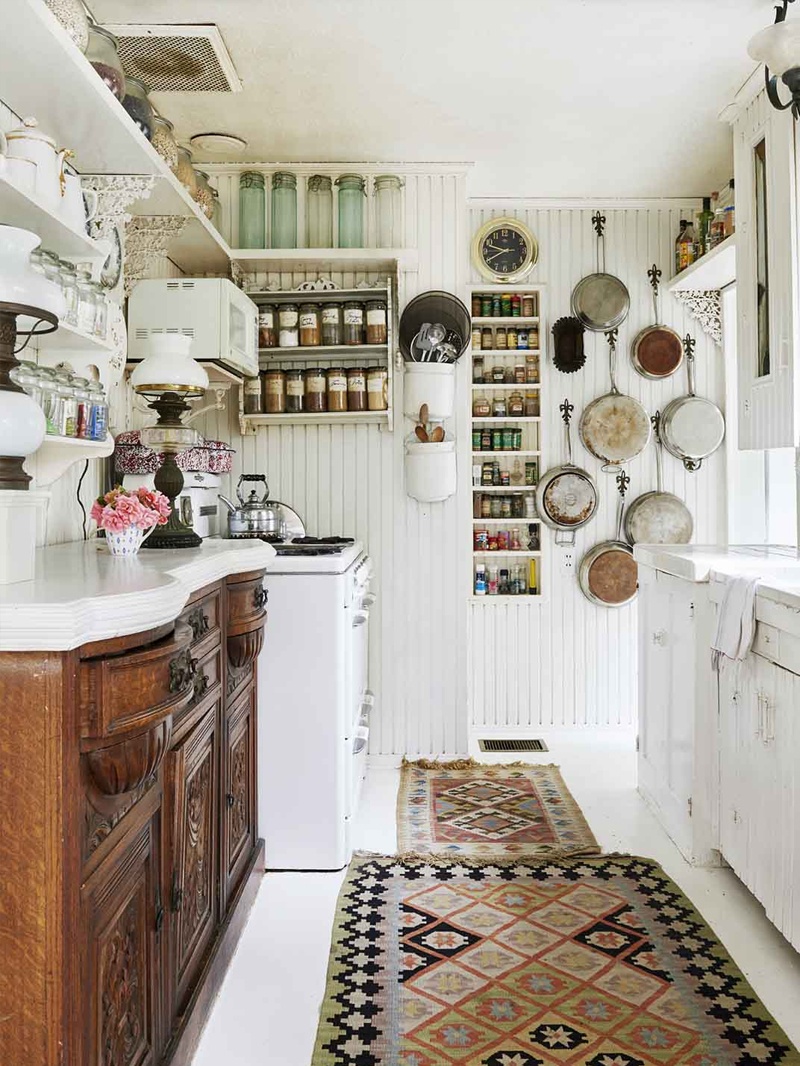 Để tạo nên căn bếp trắng phong cách Bohemian, người nội trợ nên sử dụng thảm nhiều màu sắc, bày biện đồ trang trí đẹp ra bên ngoài và đừng quên thêm sắc xanh của cây cảnh.