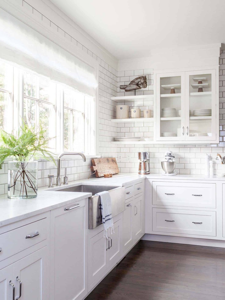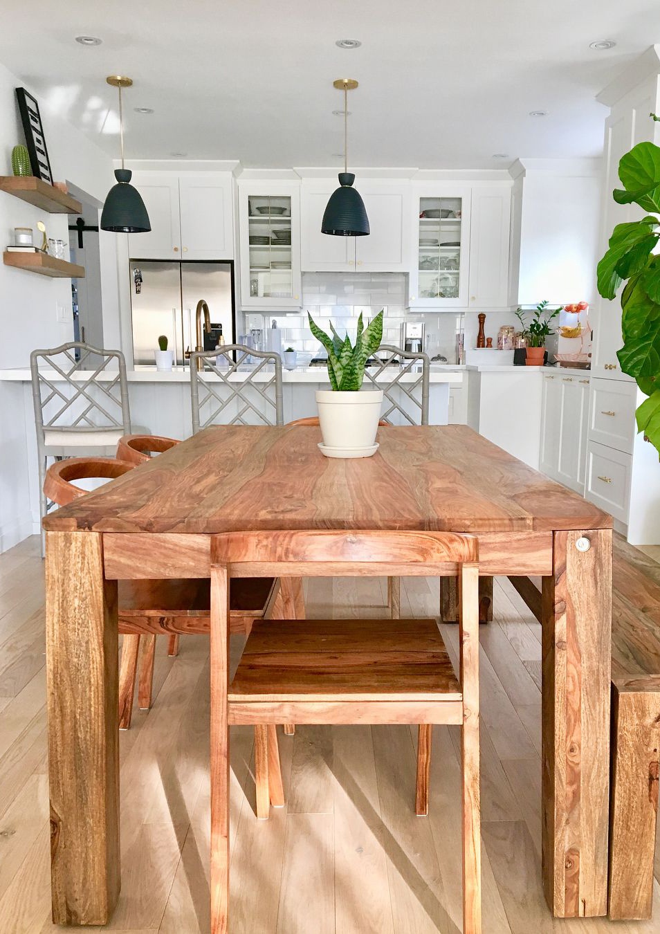 Sự hiện diện của tone màu gỗ tạo cảm giác ấm cúng, gần gũi cho phòng bếp màu trắng. Vật liệu không xử lý quá nhiều phù hợp bày trí trong các phong cách thiết kế nội thất khác nhau, từ vintage đến hiện đại, tối giản…