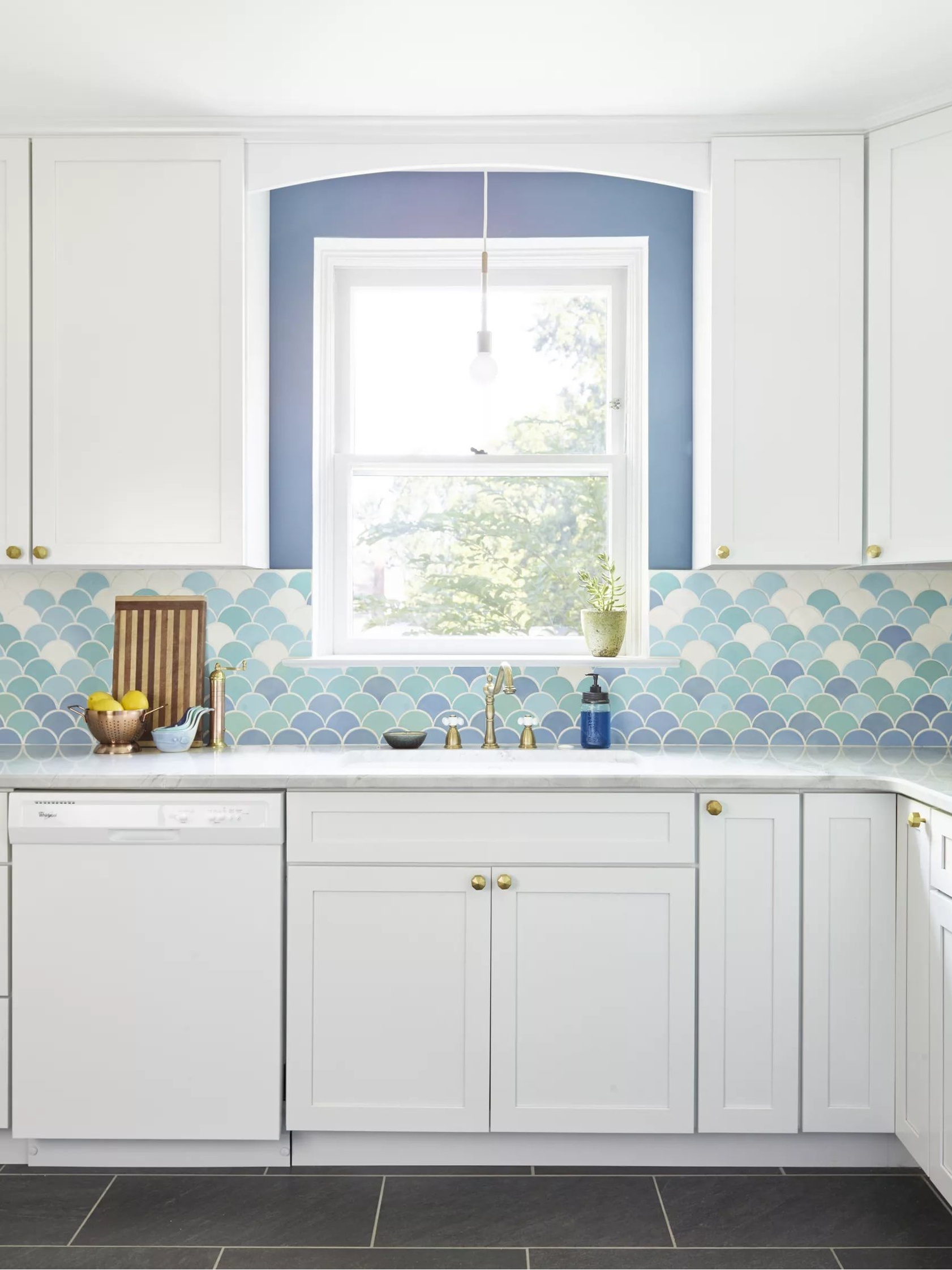Những ngày nắng nóng, màu dương, xanh coban hoặc xanh ngọc lam phối hợp sắc trắng chủ đạo khiến phòng bếp của bạn trở nên dịu mát, thoáng đãng hơn.