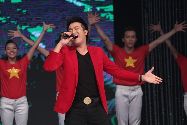 | Ca sĩ Minh Quân đóng vai trò làm phóng viên trong phóng sự. Anh xuất hiện trên sân khấu chiếc áo vest đỏ nổi bật khi thể hiện ca khúc Việt Nam ơi. |