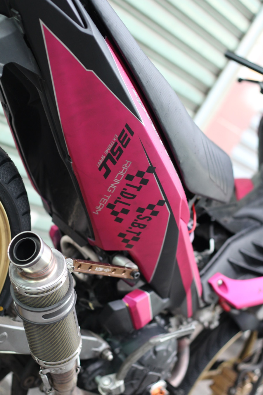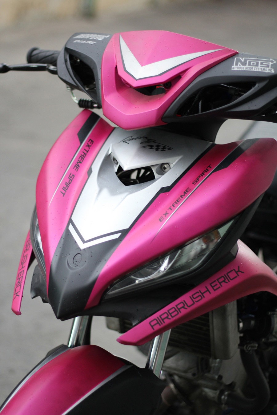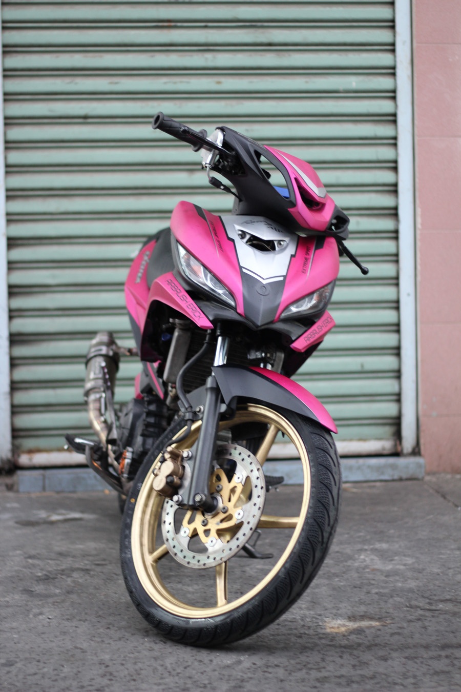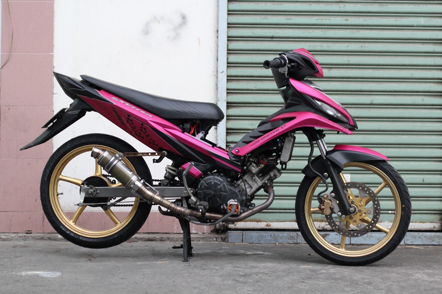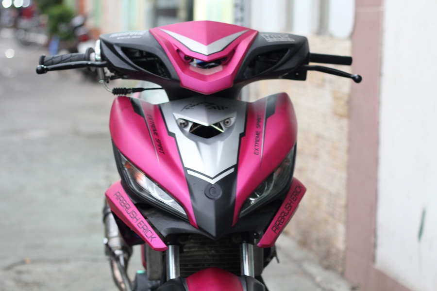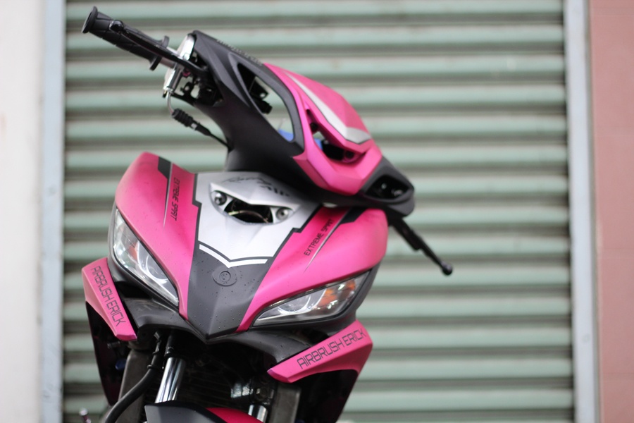 | Phần đầu xe được độ lại với dàn vỏ của chiếc Yamaha Luvias trông khá ngầu. Cùng với đó là sự kết hợp giữa hai tông màu hồng đen, khá lạ mắt. |
