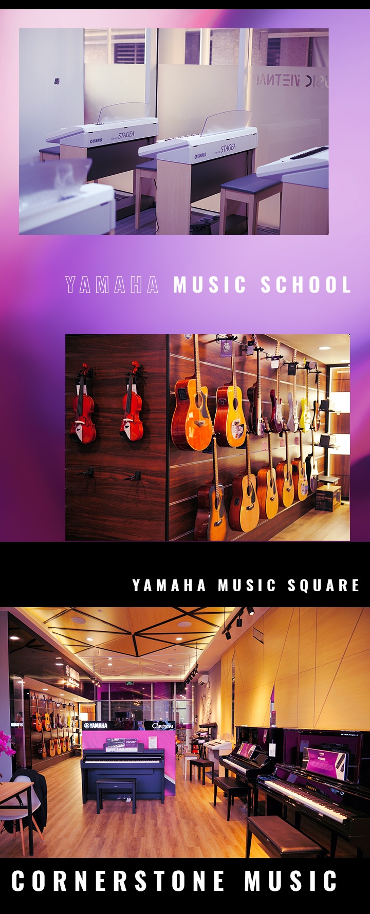 Tháng 3/2023, Yamaha chính thức đưa cửa hàng Yamaha Music Square - Cornerstone Music vào hoạt động. Đây là mô hình cửa hàng trưng bày và kinh doanh tất cả nhạc cụ chính hãng của Yamaha, kết hợp với Trường Âm nhạc Yamaha. Với niềm tin âm nhạc và nghệ thuật không giới hạn, thương hiệu xây dựng Music Square - điểm đến để người yêu nhạc Việt trải nghiệm nhạc cụ chất lượng cao và có cơ hội tiếp nhận tư duy âm nhạc mới mẻ.
