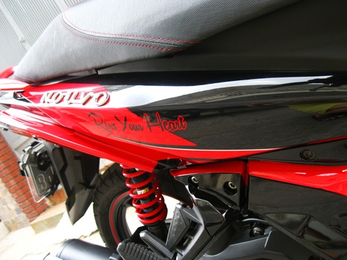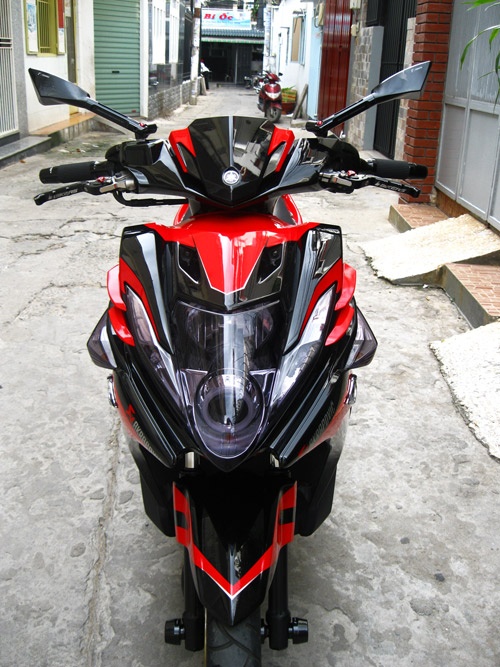 Nguyên bản chiếc Yamaha Nouvo SX cũng là màu đỏ - đen nhưng các mảng màu tách biệt. Khi được độ lại, chiếc xe đã có các mảng màu đen, đỏ đan xen khiến tổng thể xe cầu kỳ và góc cạnh hơn. |