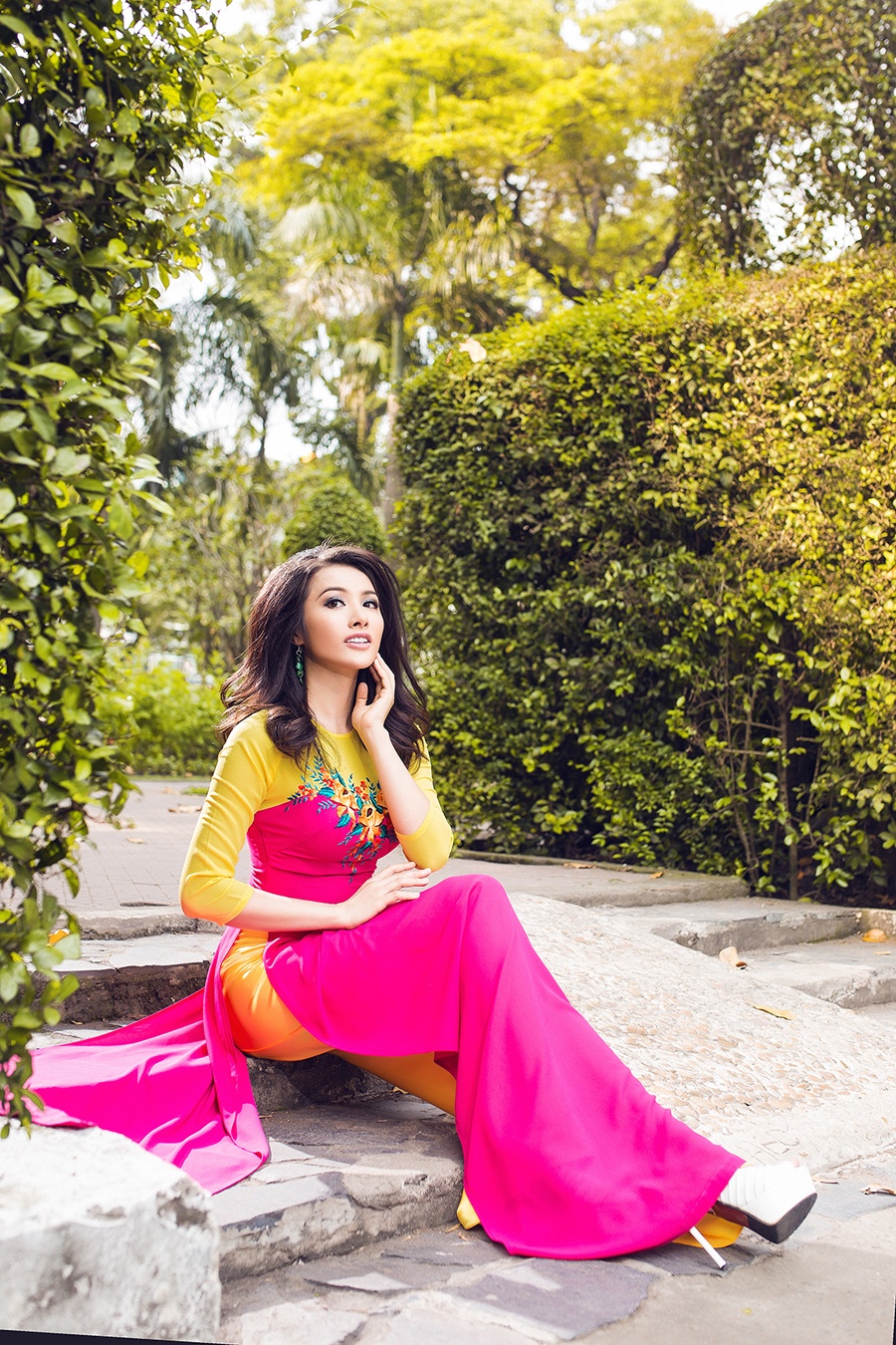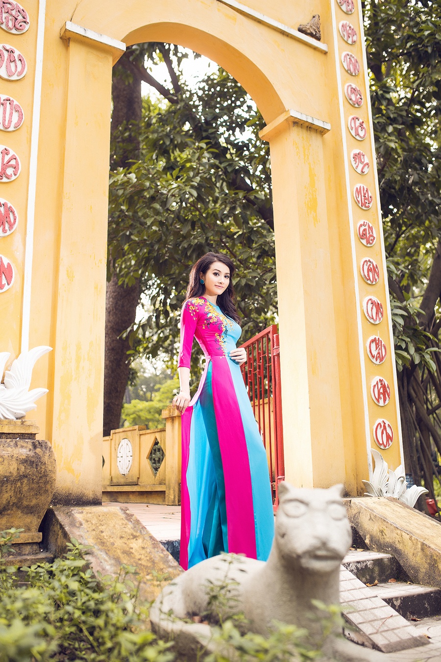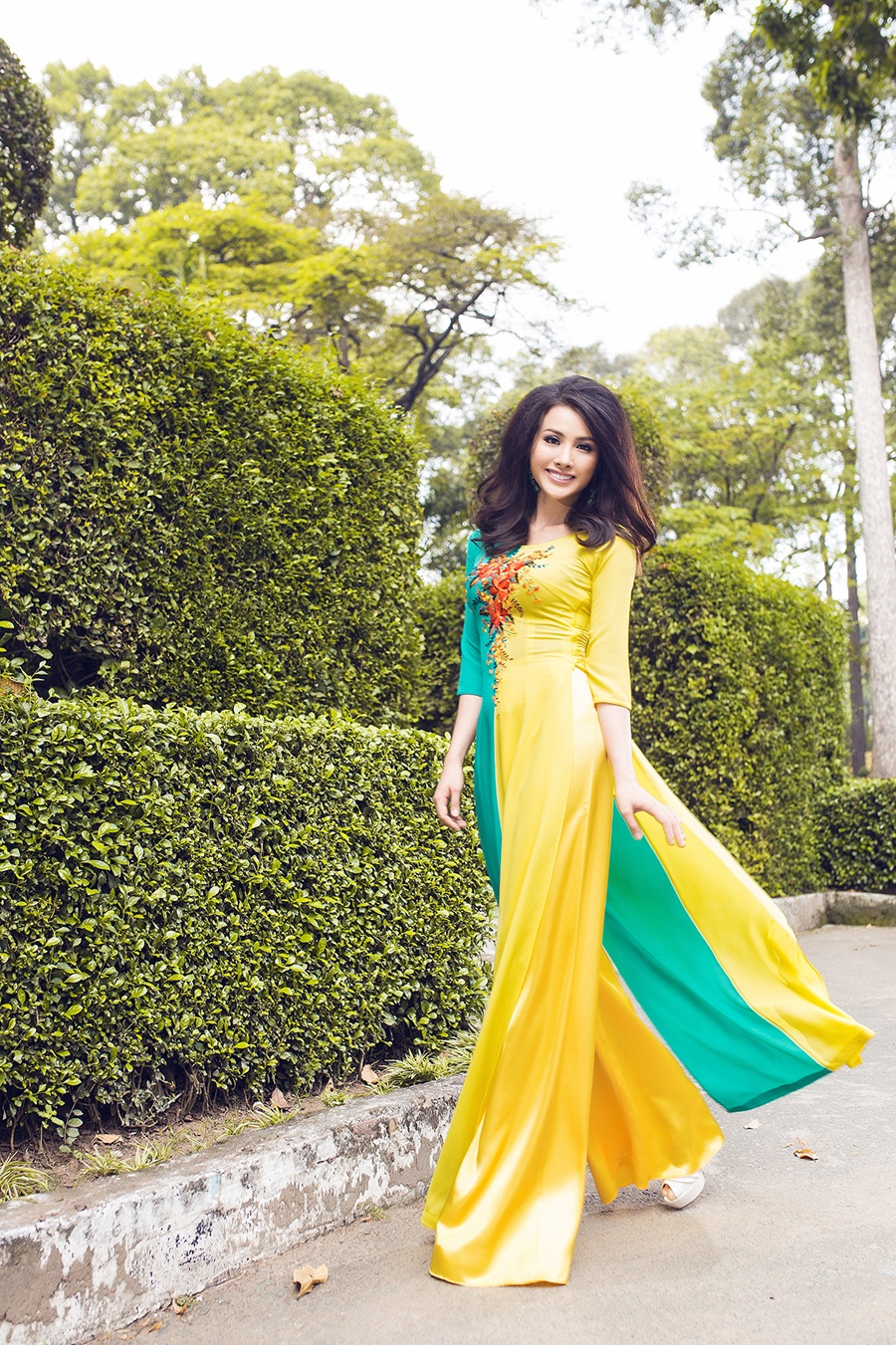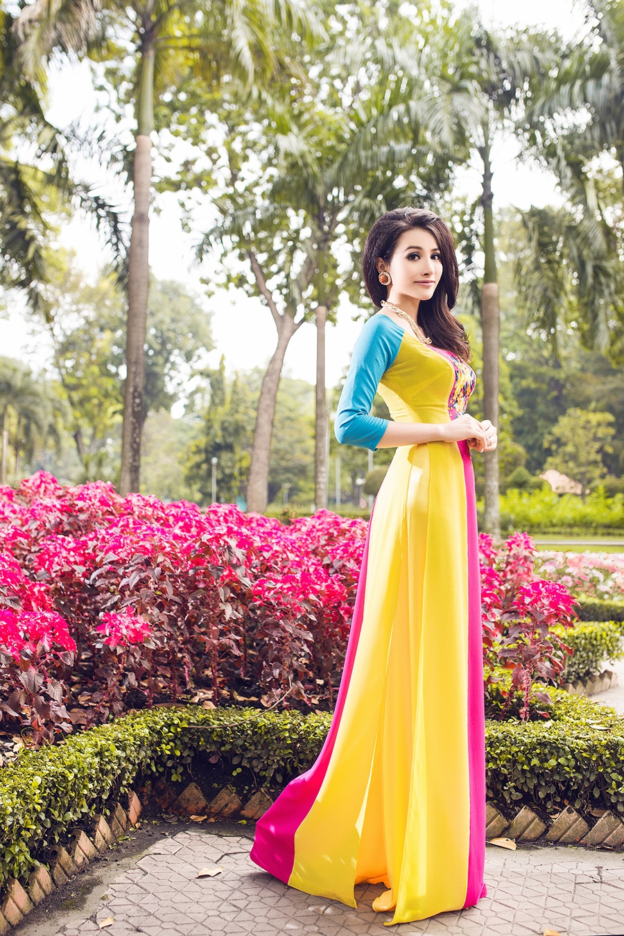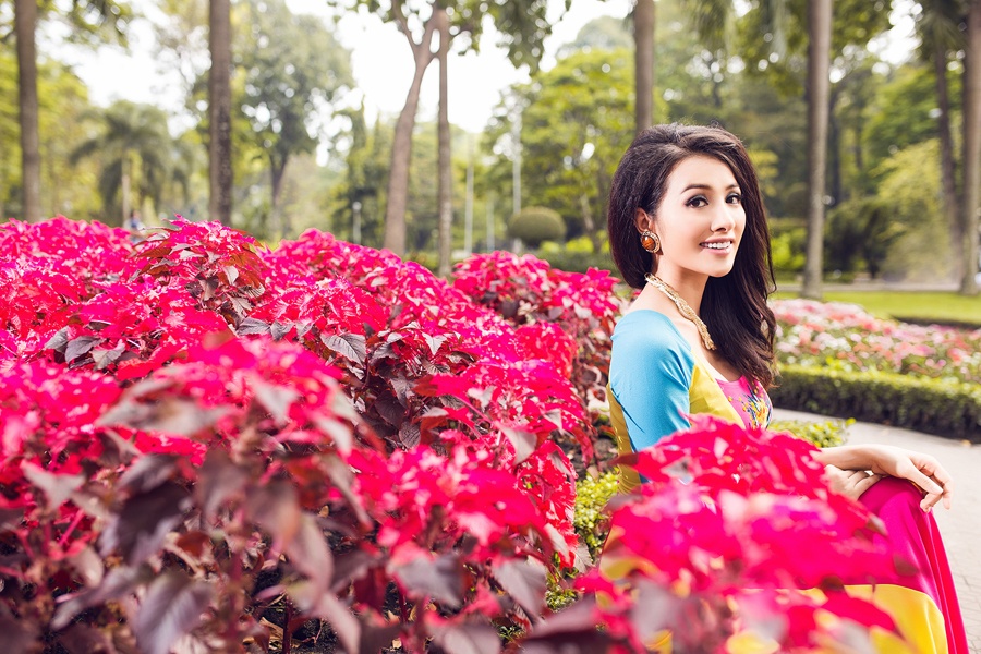 | Những chiếc áo dài xuân sắc màu rực rỡ giúp nữ người mẫu nổi bật và cuốn hút. |