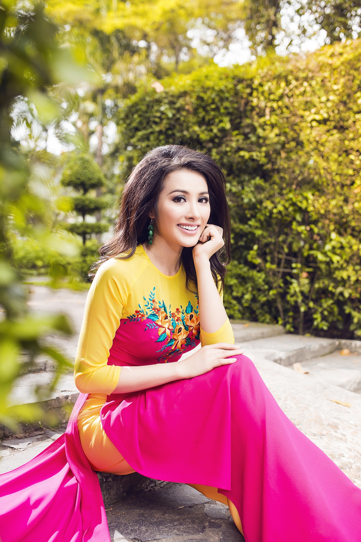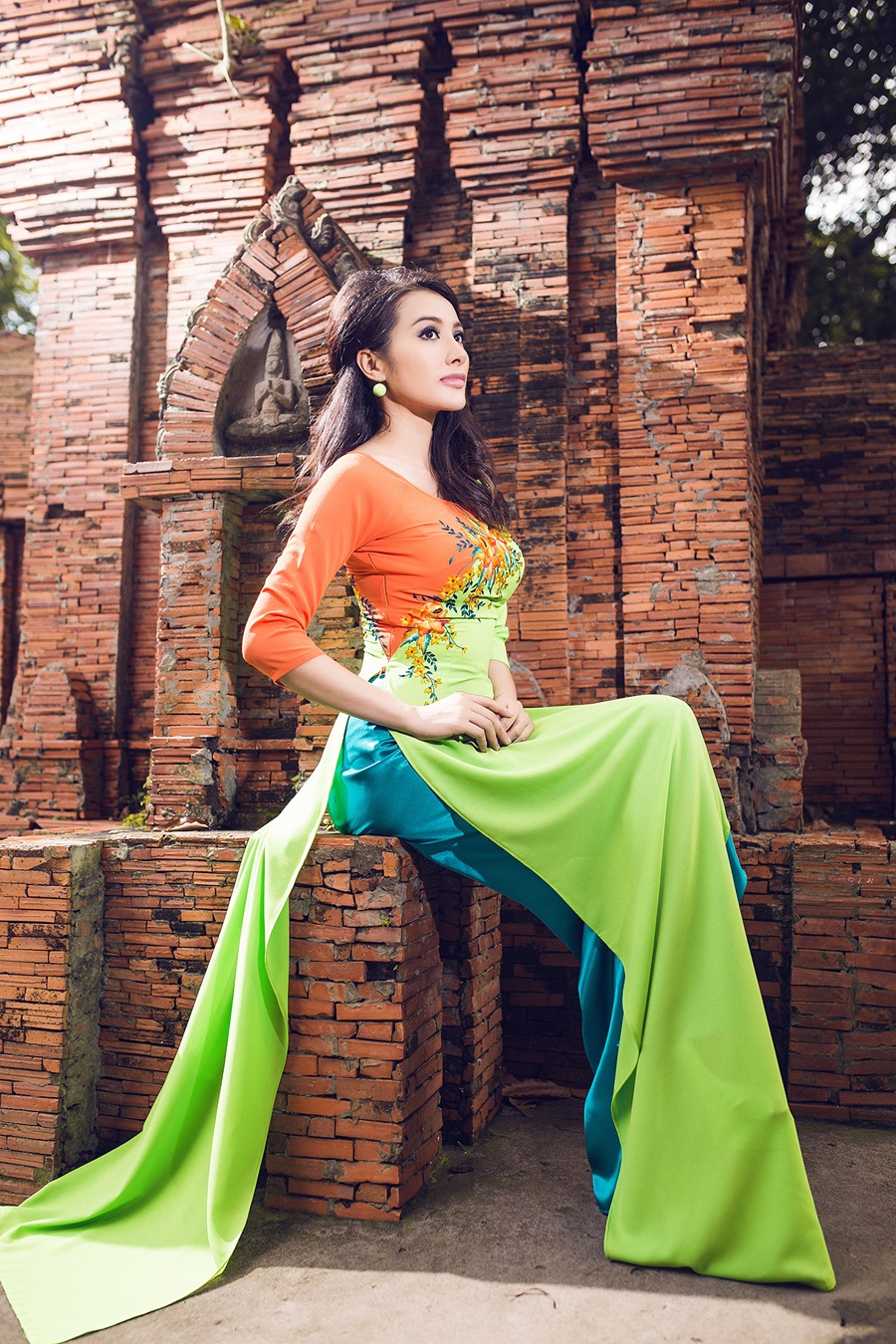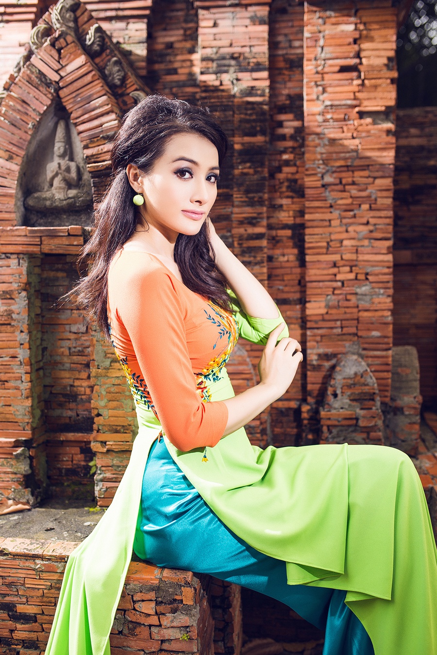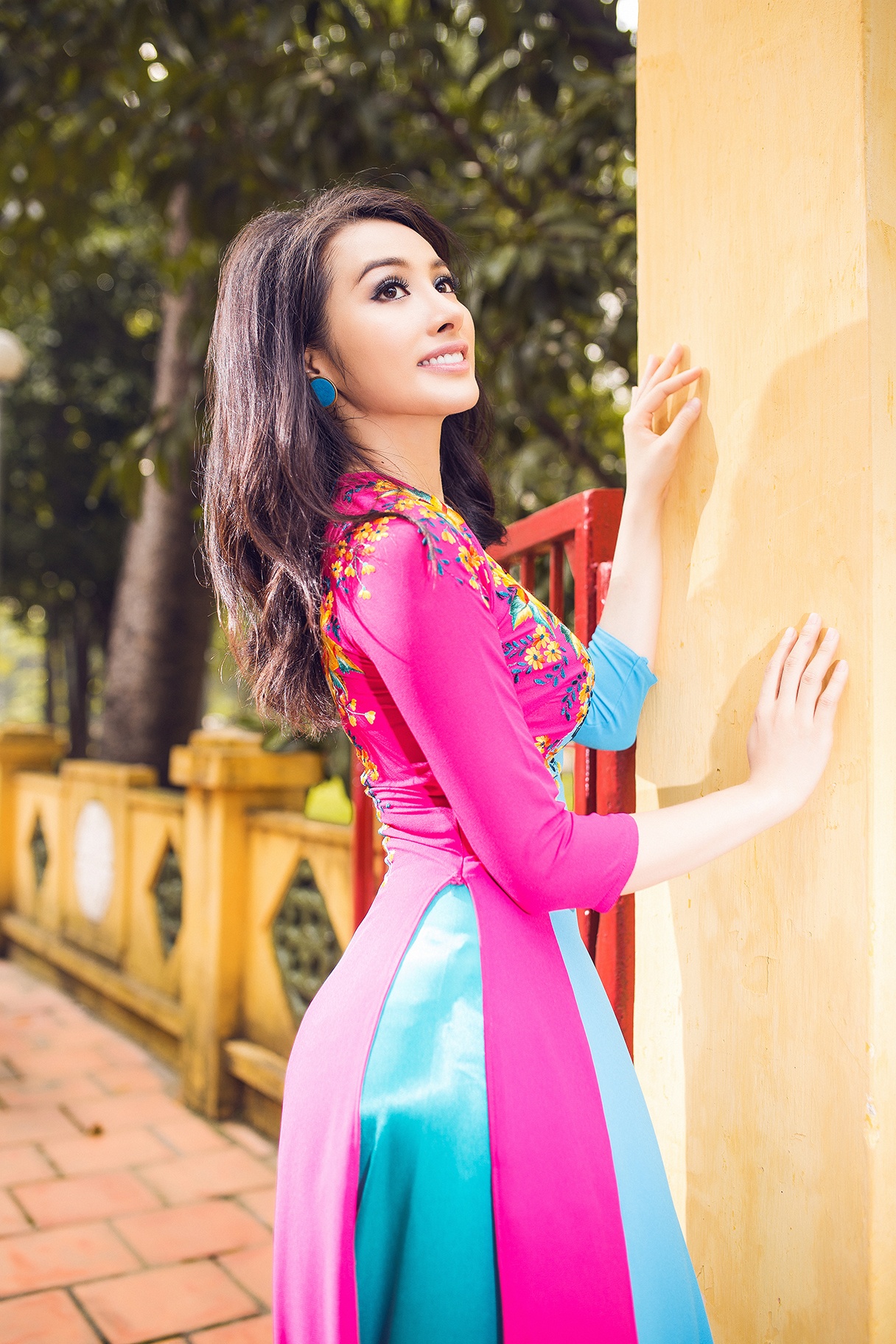 | Những chiếc áo dài xuân sắc màu rực rỡ giúp nữ người mẫu nổi bật và cuốn hút. |