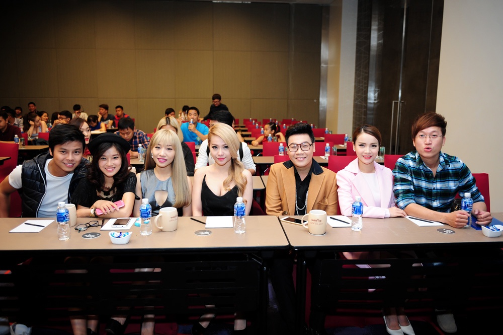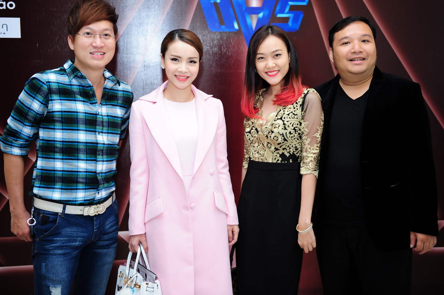 | 2 giám khảo Sỹ Luân, Yến Trang chụp hình cùng vợ chồng nhạc sĩ Nguyễn Hà - Minh Trang. Anh trai đạo diễn Quang Huy cũng là người đưa phiên bản game show Sao là Sao từ Thái Lan về Việt Nam. |