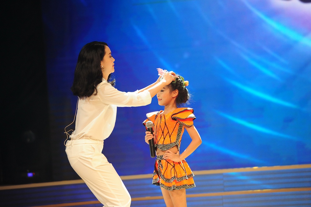 | Cùng với người đồng đội Phan Hiển, Đoan Trang cho rằng: "Đi thi là phải như vậy, vừa bước ra là phải tự tin, mắt nhìn thẳng ống kính, nhìn thẳng khán giả. Cô rất thích tiết mục của con. Con hôm nay làm rất tốt". |