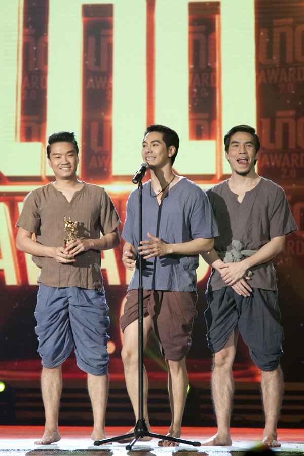 | Các nam diễn viên trong Tình người duyên ma lên sân khấu nhận giải thưởng. |