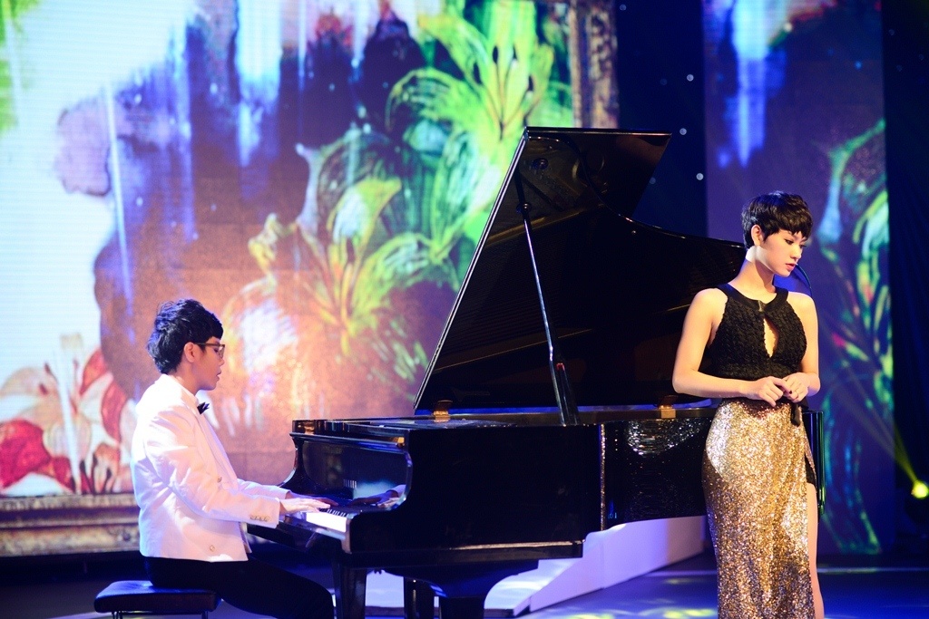 Vũ Cát Tường đệm đàn cho Trà My Idol hát.