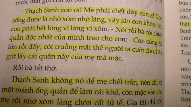 "Thạch Sanh con ơi! Mẹ phải chết đây con ạ! Con sống được là nhờ xóm nhờ làng, vậy khi con khôn lớn, con phải hết lòng vì làng vì xóm" - Nói rồi bà cởi chiếc quần độc nhất của mình trao cho con - "Con cũng đã lớn rồi đấy, cởi truồng mãi thế người ta cười cho, hãy giữ lấy cái quần này của mẹ mà mặc.
