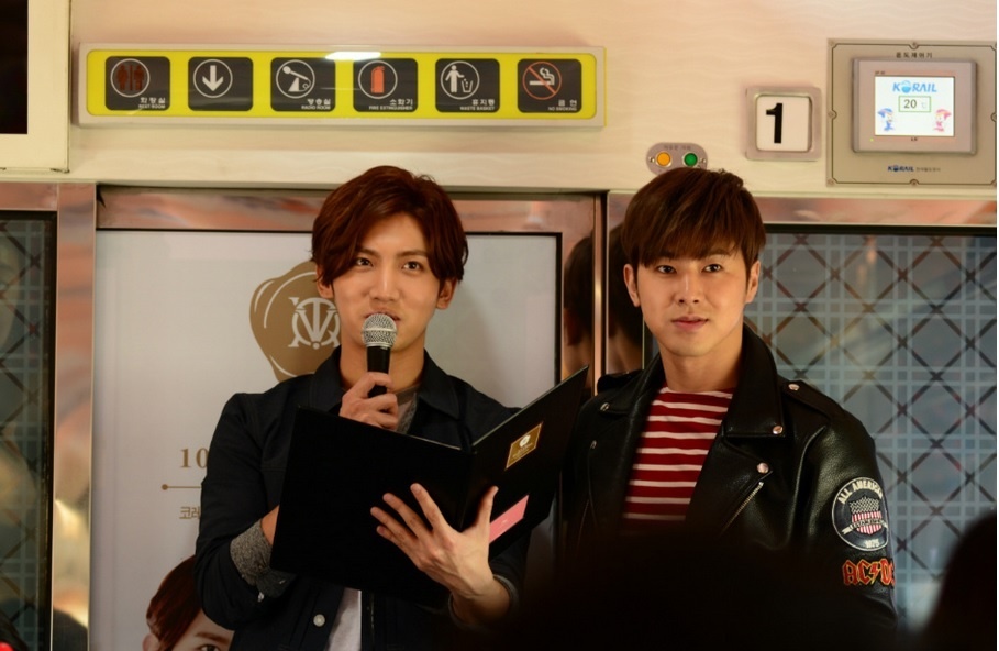| TVXQ giao lưu cùng fan trong một toa tàu. Ảnh: daum |
