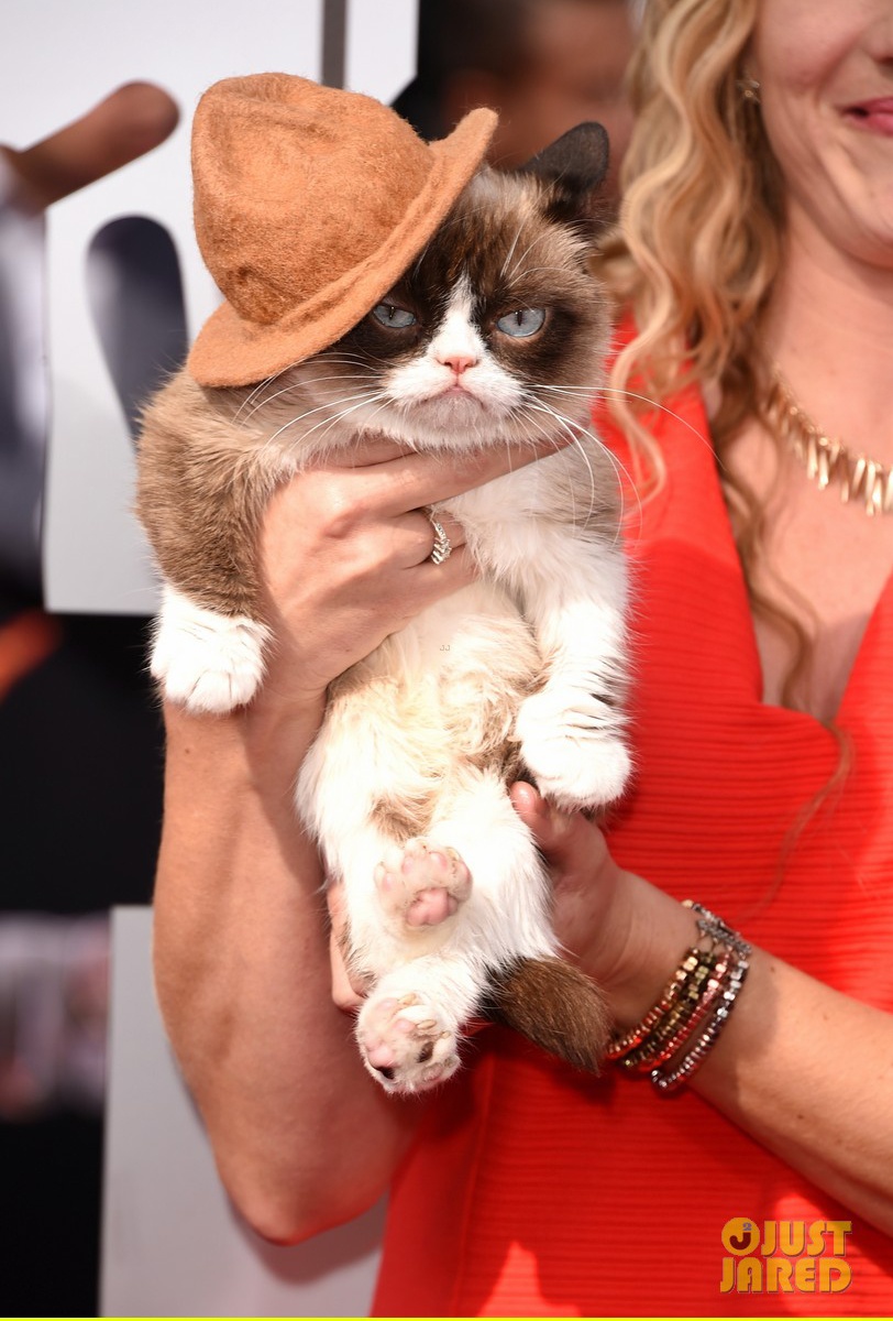 | Chú mèo Grumpy Cat cũng được xuất hiện trên thảm đỏ, trước hàng trăm ống kính phóng viên như bất kỳ ngôi sao Hollywood nào. Có tên thật là Tardar Sauce, Grumpy Cat là chú mèo rất nổi tiếng trên Internet vì gương mặt cáu kỉnh. Trang Facebook của chú mèo này đã có hơn 4 triệu lượt "like" (yêu thích). |