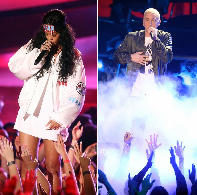 | Rihanna và Eminem có màn kết hợp đầy sôi động khi thể hiện ca khúc The Monster. |