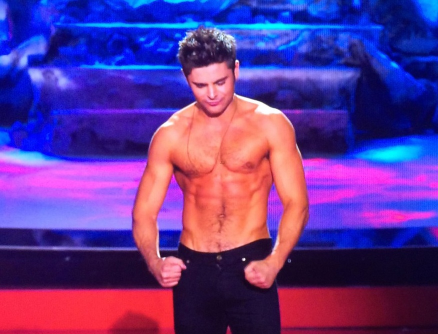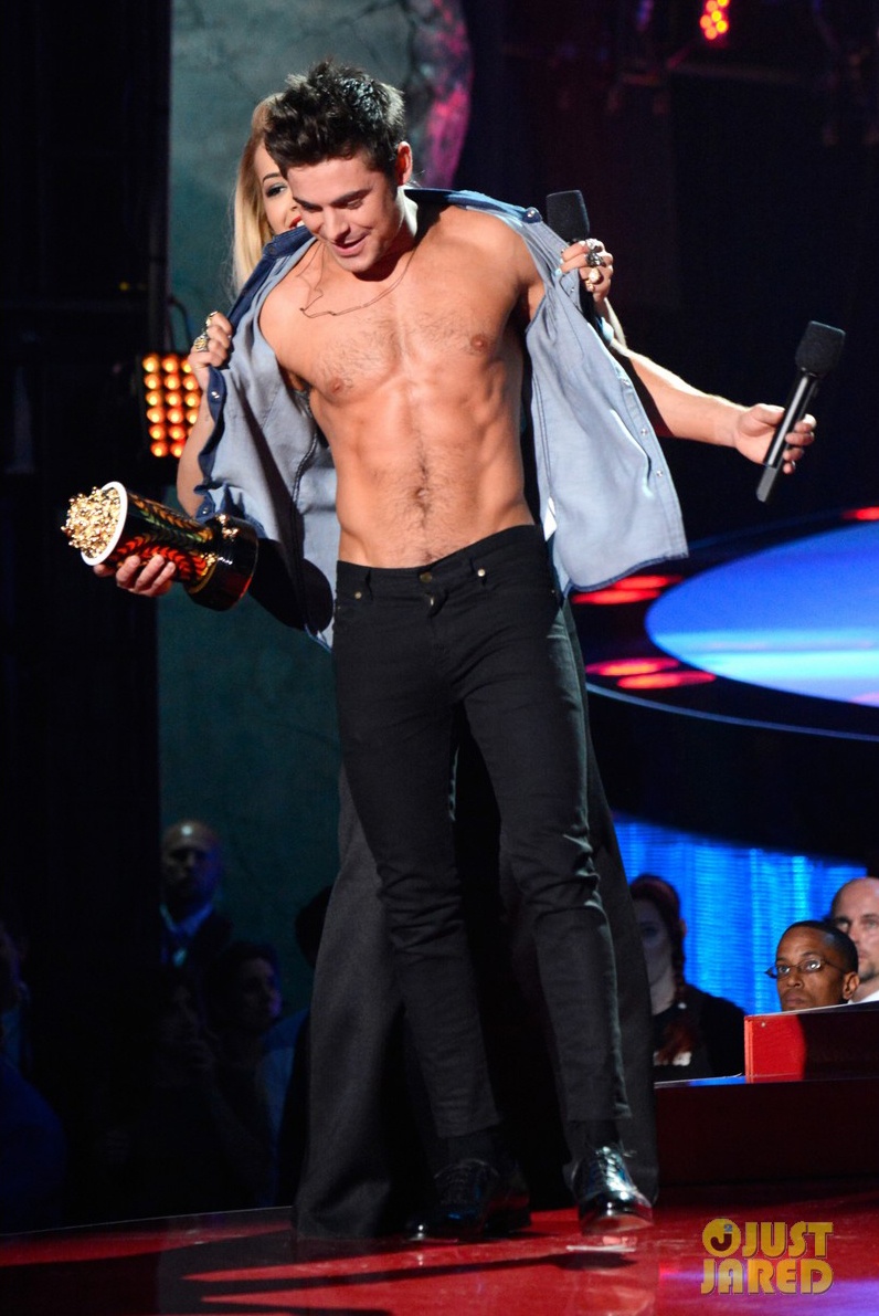 Khi đang có những lời chia sẻ đầu tiên trên sân khấu nhận giải, Zac Efron đã bất ngờ bị Rita Ora giật bung cúc áo từ phía sau. Không tỏ ra khó chịu, Zac Efon tiếp tục khiến fan bất ngờ khi vui vẻ cởi phăng chiếc áo denim đang mặc, để lộ cơ thể săn chắc, quyến rũ.