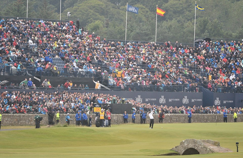 | Bất chấp thời tiết không thuận lợi, rất đông người hâm mộ đã có mặt tại St Andrews để chứng kiến vòng cuối của The Open 2015. |