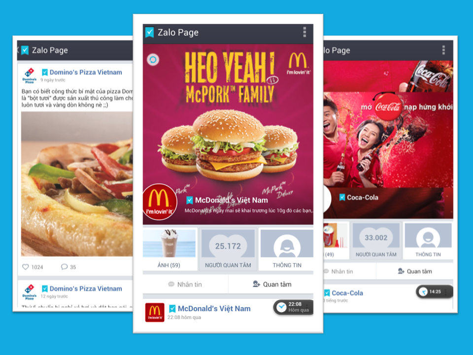 Nhiều nhãn hàng toàn cầu như McDonald’s, Coke, Domino’s Pizza, Lotte… chọn Zalo làm kênh tiếp cận và chăm sóc khách hàng. Zalo dần vượt qua xuất phát điểm ban đầu là công cụ liên lạc để trở thành tiện ích phục vụ cho nhu cầu đa dạng của đời sống con người trên các thiết bị di động.