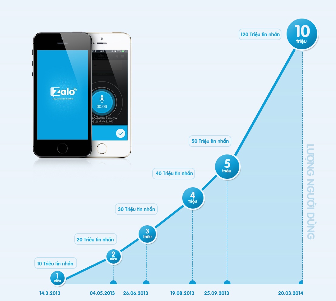 Hôm nay (20/3), Zalo chính thức đạt 10 triệu người dùng, với 120 triệu tin nhắn trao đổi qua hệ thống mỗi ngày. So với con số 1 triệu vào tháng 3/2013, OTT Việt Nam đã tăng trưởng 10 lần chỉ sau 1 năm. Đạt mốc 10 triệu người dùng, Zalo đã phủ sóng 50% thị trường điện thoại thông minh ở Việt Nam và cho thấy sự bắt nhịp của ứng dụng Việt trong bối cảnh OTT đang bùng nổ trên toàn cầu.